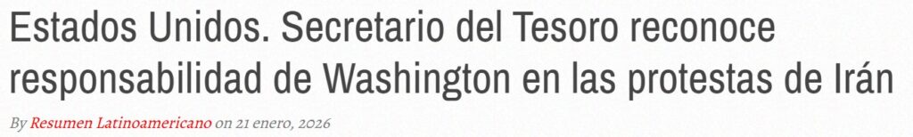 Por ejemplo, la guerra económica, de la que alardeó Scott Bessent, secretario del Tesoro, ante el Congreso, en Davos y en Fox News, para que no quedara ninguna duda: “Lo que [hemos hecho] en el Tesoro es crear una escasez de dólares en el país”. La estrategia llegó a una “gran culminación en diciembre, cuando uno de los bancos más grandes de Irán quebró… la moneda iraní entró en caída libre, la inflación explotó y, por lo tanto, hemos visto al pueblo iraní en las calles”. Bessent lo remataba en Davos: “Esto es política económica; no hay disparos”.