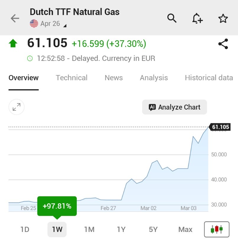 El gas comercializado en el mercado TTF sube un 97,81% en una semana, mientras ABC habla de la dependencia del gas de Estados Unidos.