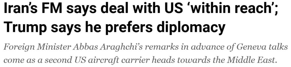 El ministro de AAEE de Irán dice que un acuerdo con EEUU está “al alcance”; Trump dice que prefiere la diplomacia. Al Jazeera, 25 de febrero de 2026.