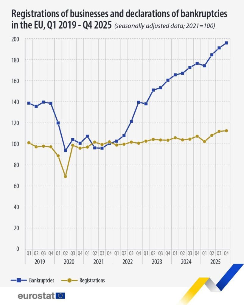Registro de empresas y declaraciones de bancarrota en la UE, 2019 – 2025. Gráfico: Eurostat.
