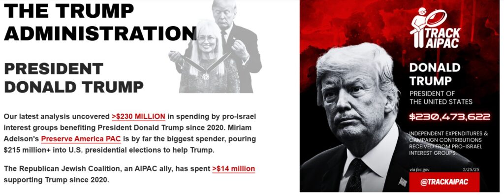 El portal Track AIPAC rastrea todas las subvenciones que reciben los congresistas, los senadores, y los candidatos al Congreso y al Senado. En Estados Unidos optaron por legalizar los sobornos a los políticos: lo llaman “lobby”. Ciñéndonos únicamente a las cifras oficiales, el American Israel Committee for Public Affairs destina cientos de millones de dólares en “donaciones” a legisladores, senadores y candidatos, con el obvio propósito de que defiendan los intereses de Israel, no los de Estados Unidos.
