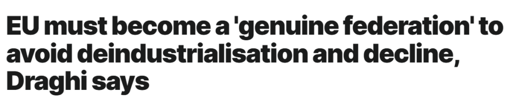 Draghi también yerra con el diagnóstico: la solución no puede consistir en la centralización burocratizada, que es el objetivo último tras el maquillaje de la “auténtica federación” que propone. Como he recogido reiteradamente en este blog, el propósito de los eurócratas de Bruselas es el de anular la soberanía de los estados miembros para sustituirla por la federalización centralizada que propone Draghi.