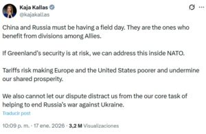 Ante las amenazas, posteriormente retiradas, de Donald Trump de imponer aranceles a los países europeos si no se alcanzaba un acuerdo sobre Groenlandia, la inefable Kaja Kallas, sin mencionar a Estados Unidos, se mostraba muy preocupada, porque Rusia y China debían de estar de fiesta ante las desavenencias entre aliados. La estonia calificaba de “disputa” la pretensión de Trump de hacerse con dos millones de kilómetros cuadrados de un país de la Unión Europea, y aprovechaba para pedir que la “disputa” no nos distrajera de su fijación: Rusia y la guerra en Ucrania.