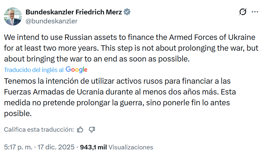 Finalmente, Francia salió al rescate de Bélgica, y cuando Macron mostró su oposición a lo que tenía pinta de convertirse en un robo directo, Merz y von der Leyen se vieron obligados a recular, en un apoteósico fracaso político, y el Consejo Europeo terminó acordando la emisión de deuda conjunta, por valor de 90.000 millones, para solucionar las acuciantes necesidades financieras de ese Estado fallido en el que occidente ha convertido a Ucrania, con la complicidad de sus élites.