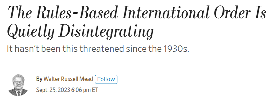Walter Russell Mead, miembro del Hudson Institute, una de las cavernas del pensamiento neoconservador, se lamentaba en una columna en el Wall Street Journal de la “desintegración” del orden internacional basado en reglas, liderado por Estados Unidos. Ilustrada con una única fotografía, la de Putin, la columna repasaba la lista actualizada de villanos y se quejaba de que Washington y sus aliados no hicieran lo necesario para que los malvados respetaran esas “reglas”, a las que occidente se adhiere inequívocamente. Modo ironía activado.