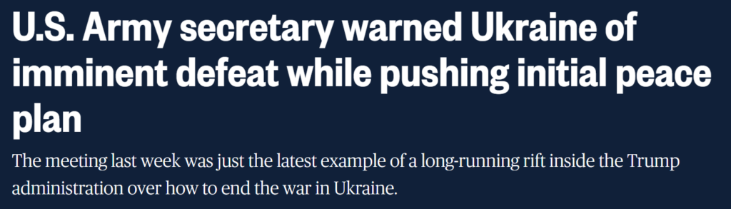El secretario del Ejército de EE. UU. advirtió a Ucrania de una derrota inminente mientras impulsaba un plan de paz inicial. NBC News, 26 de noviembre de 2025.