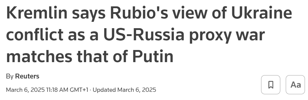 Putin está dispuesto a pasar por alto la notoria contradicción que supone la admisión del carácter «proxy» de la guerra en Ucrania por parte de Marco Rubio, y la actitud de su jefe al presentarse como mediador, porque piensa que le viene bien hacerlo. Por cierto, el secretario de Estado estuvo notoriamente ausente de dos reuniones clave: la última de los ministros de Asuntos Exteriores de miembros de la OTAN, y la que mantuvieron Steve Witkoff y Jared Kushner con Putin, durante 5 horas, en Moscú. ¿Estuvieron 5 horas hablando de Ucrania, o trataron otros temas?