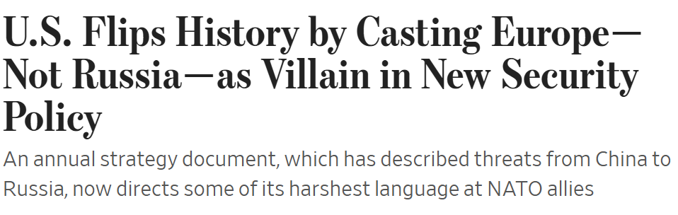 Por si quedaba alguna duda del giro de Trump, la última edición de la Estrategia de Seguridad Nacional de Estados Unidos, publicada en noviembre, afirma literalmente lo siguiente: “Es un interés central de los Estados Unidos negociar un cese expeditivo de las hostilidades en Ucrania, (…) prevenir una escalada o expansión no deseada de la guerra y restablecer la estabilidad estratégica con Rusia”. Lo que viene a ser un reconocimiento de que Rusia ha ganado la partida en Ucrania y toca recomponer los puentes con Moscú. Trump está apostando por el caballo ganador, y aunque el titular del Wall Street Journal es hiperbólico, no es de extrañar que los europeos estén hiperventilando…