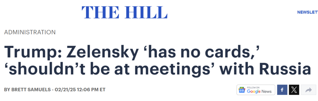 Trump: Zelenski “no tiene cartas”, “no debería estar en reuniones” con Rusia. 21 de febrero de 2025.